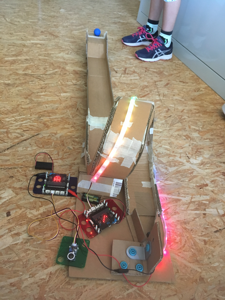 Programm erweitern und abschliessen Nachdem die Kinder das grundlegende Game fertig hatten, konnten sie es erweitern. So konnte z.B. beim Labyrinth eine Stoppuhr eingebaut werden, damit sich die Kinder untereinander vergleichen können. Beim Autorennen konnte das Zielfeld so programmiert werden, dass beim Überfahren Musik ertönt oder eine Fahne geschwenkt wird.
