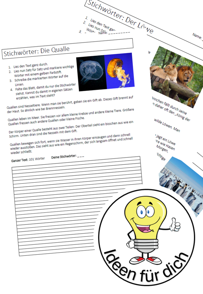 Wie alle Lernstrategien muss auch das Finden und Nutzen von Stichwörtern mehrmals geübt werden. Ich mache das gerne im Rahmen eines Buch- oder Tiervortrages. Oft bietet es sich auch im Sachunterricht an in Texten wichtige Wörter zu finden und gelb zu markieren.