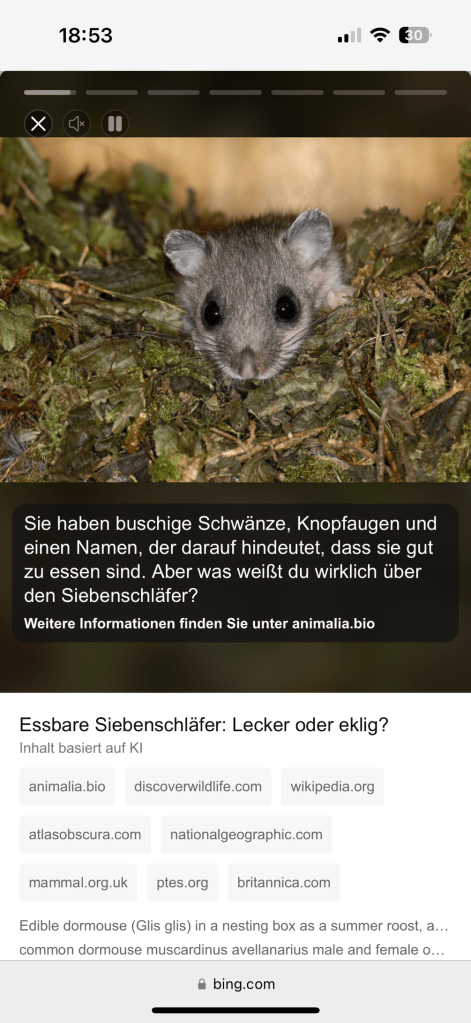Als ich mich vor Weihnachten gefragt habe, wie Siebenschläfer aussehen, habe ich eine bing-Suche gestartet und war schockiert, als ich die Infobox oberhalb der Suchresultate angeschaut habe. Da stand: „Lecker oder eklig? – Der Name Siebenschläfer deutet darauf hin, dass sie gut zu essen sind.“